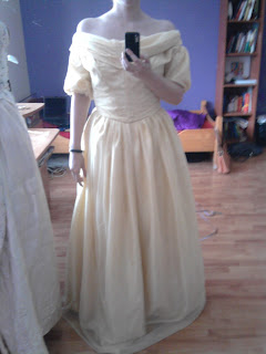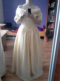 Poniżej wstawiam zdjęcia "gołej sukienki" - bez ozdób, bez koronki w mankietach, bez szarfy w pasie - i skończonej halki. Gorset i koszulę też gdzieś mam, ale na razie nie chciało mi się jej zakładać. Aha, i sukienka nie ma wszytych jeszcze haftek z tyłu więc się kiepsko układa w okolicach talii ;)