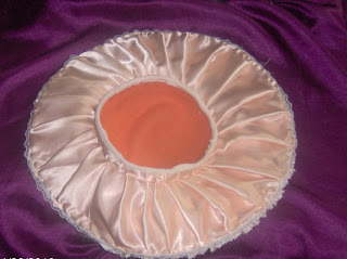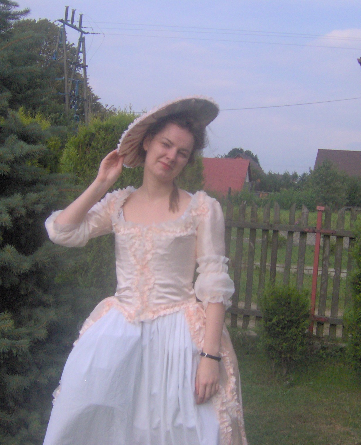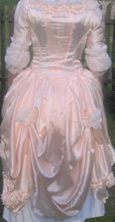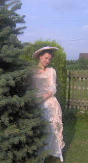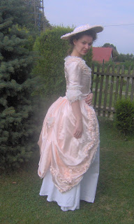 Oto moja polonaise ze morelowej (albo łososiowej) satyny, z białą bawełnianą spódnicą. Zdobienia i rękawy zrobione z takie woalu jak na firanki. Powinny być z gazy, ale takiej nie miałam i na razie to mnie nie było stać żeby ją kupić.