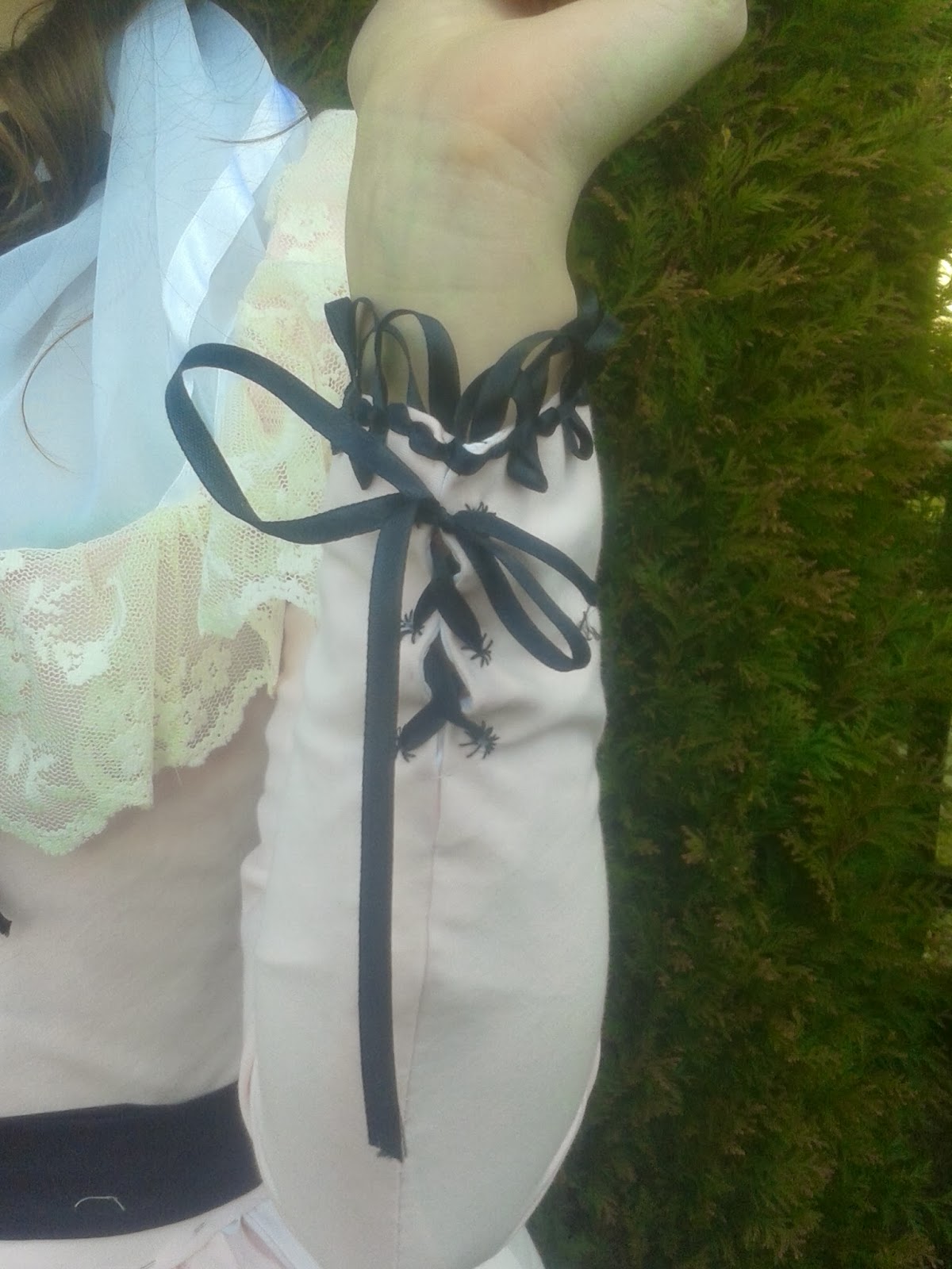 Pierwotnie chciałam w tej sukni pojawić się w Pszczynie na zlocie Krynoliny. Ale po miesiącu na manekinie pojawił się problem... Manekin jest zwrócony tyłem do okna, przez które pada światło słoneczne przez jakieś 3/4 dnia. No i pierwszy raz w życiu tkanina mi wyblakła! Tego słońca aż tyle nie było. Jak się przyjrzycie to zauważycie, że przód jest ciemniejszy. Tył stanika jeszcze się uratował, bo zasłonięty był czarnym fichu (które ma już jaśniejszą plamę na środku). Musiałam wyciąć z przodu po 20 cm z każdej strony bo i tam sięgnęły promienie.