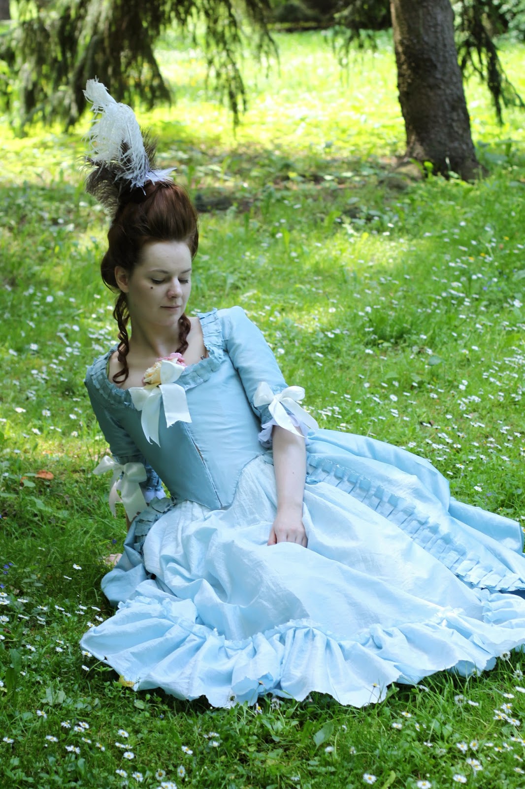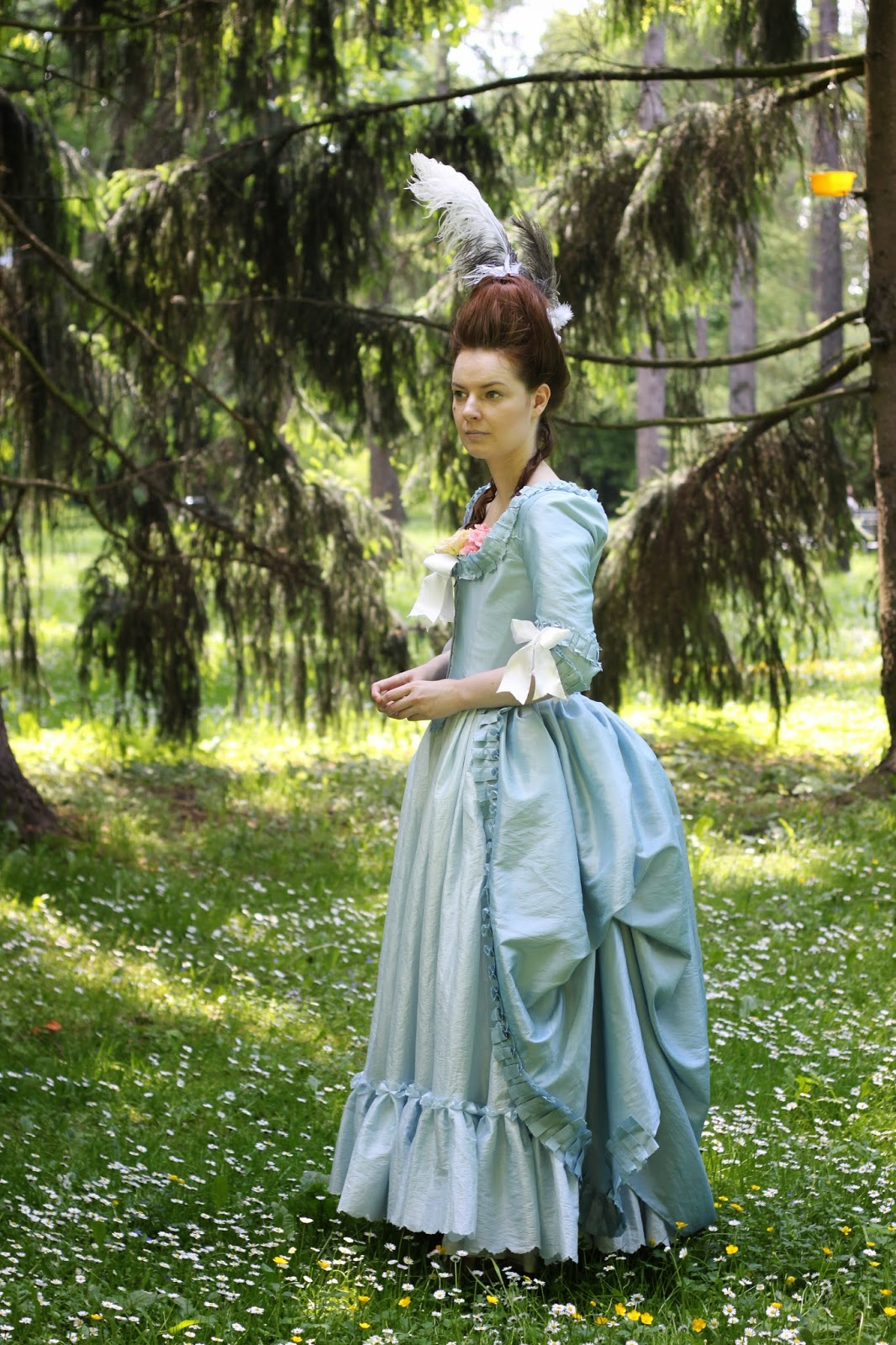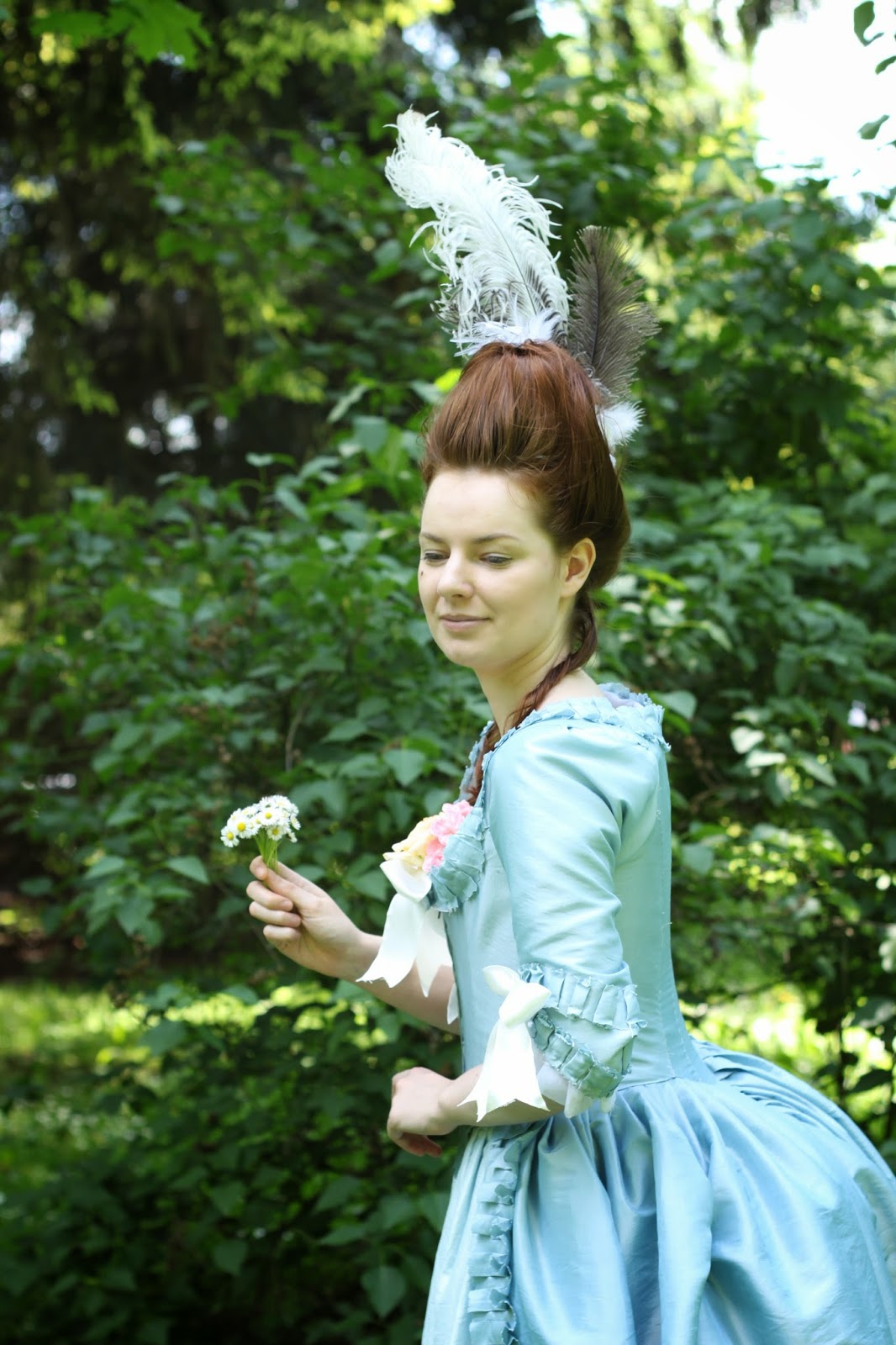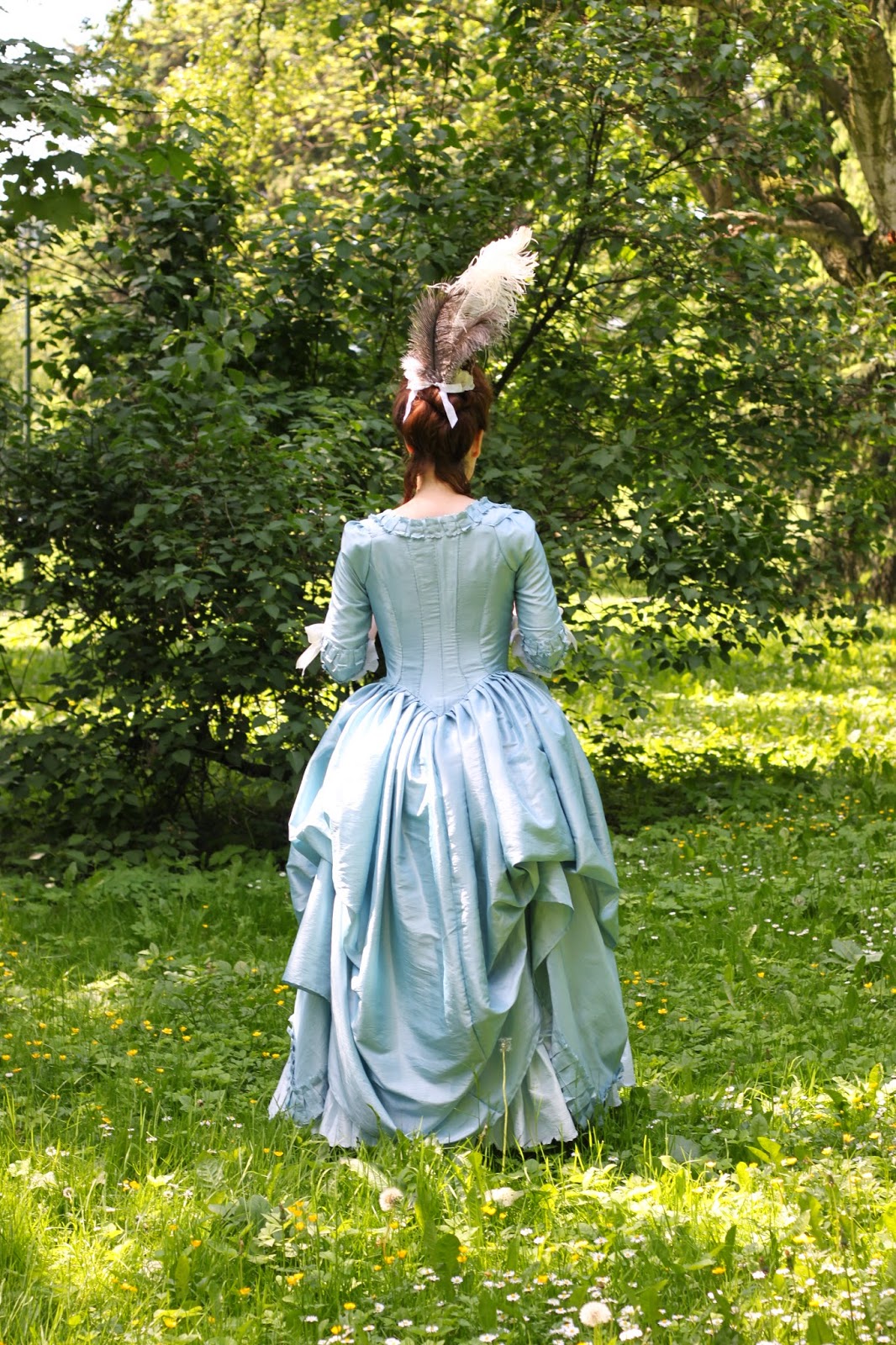 So, here are the final results matched with my blue robe a l'anglaise retrousse and several ostrich feathers: