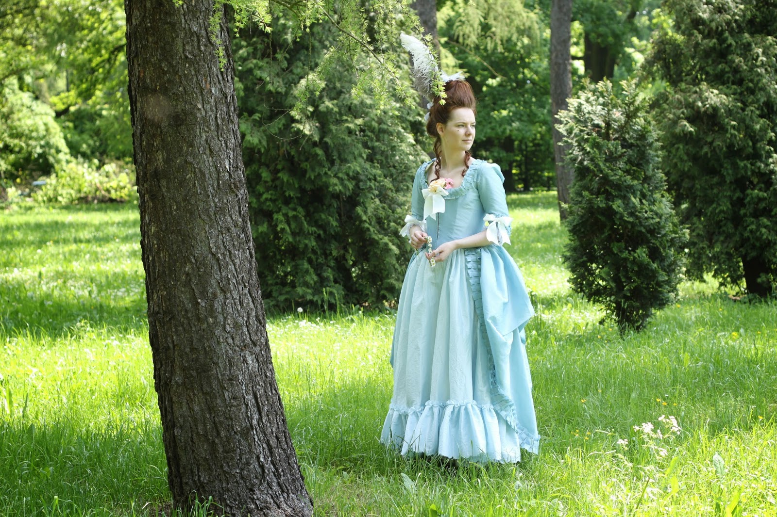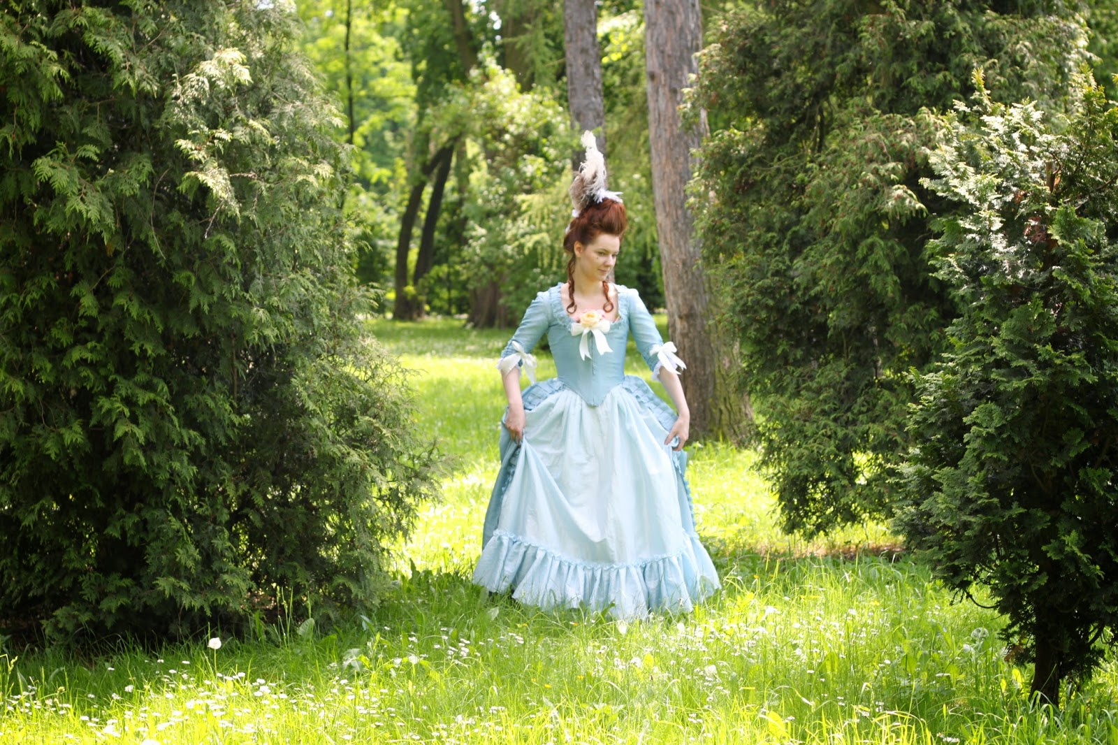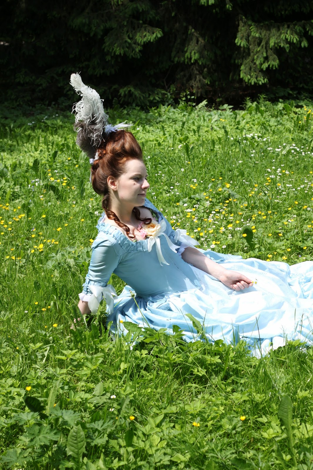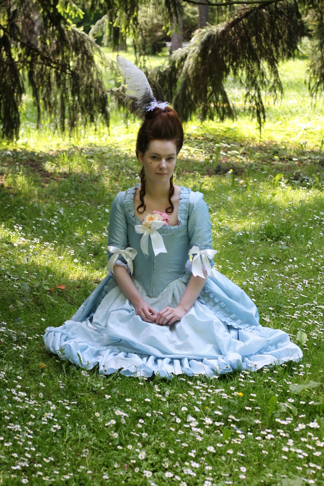 So, here are the final results matched with my blue robe a l'anglaise retrousse and several ostrich feathers: