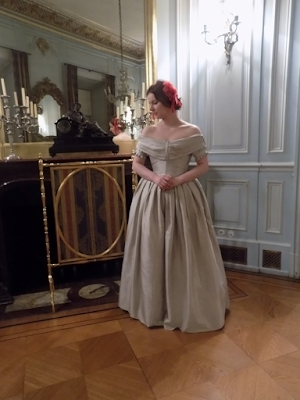 Poniżej (i powyżej) przedstawiam kilka zdjęć z wieczoru, którego hitem okazała się różowa kanapa idealnie dostosowana do siedzenia w gorsecie! Wcieliłam się w postać Adelheid von Hochberg, której portret znajduje się na ekspozycji w Zamku. Miałam na sobie jedwabną suknię z 1850 r. uszytą jesienią z okazji wernisażu tej wystawy. Kolor w sztucznym świetle jest ciepły i beżowy, ale zapewniam, w świetle dziennym to piękne srebro.