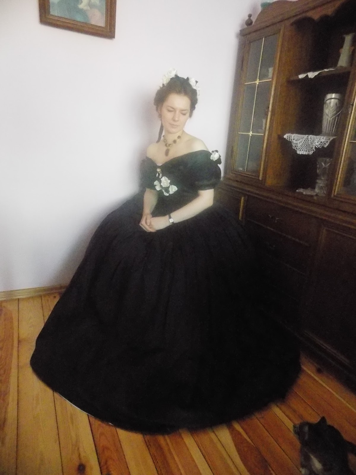 Jednak zapewniam, że poczyniłam już plany by suknię obfotografować i może zimą coś w tym temacie się pojawi. Co więcej, od roku suknia ma też czarny żałobny bonnet i płaszczyk z futrem.