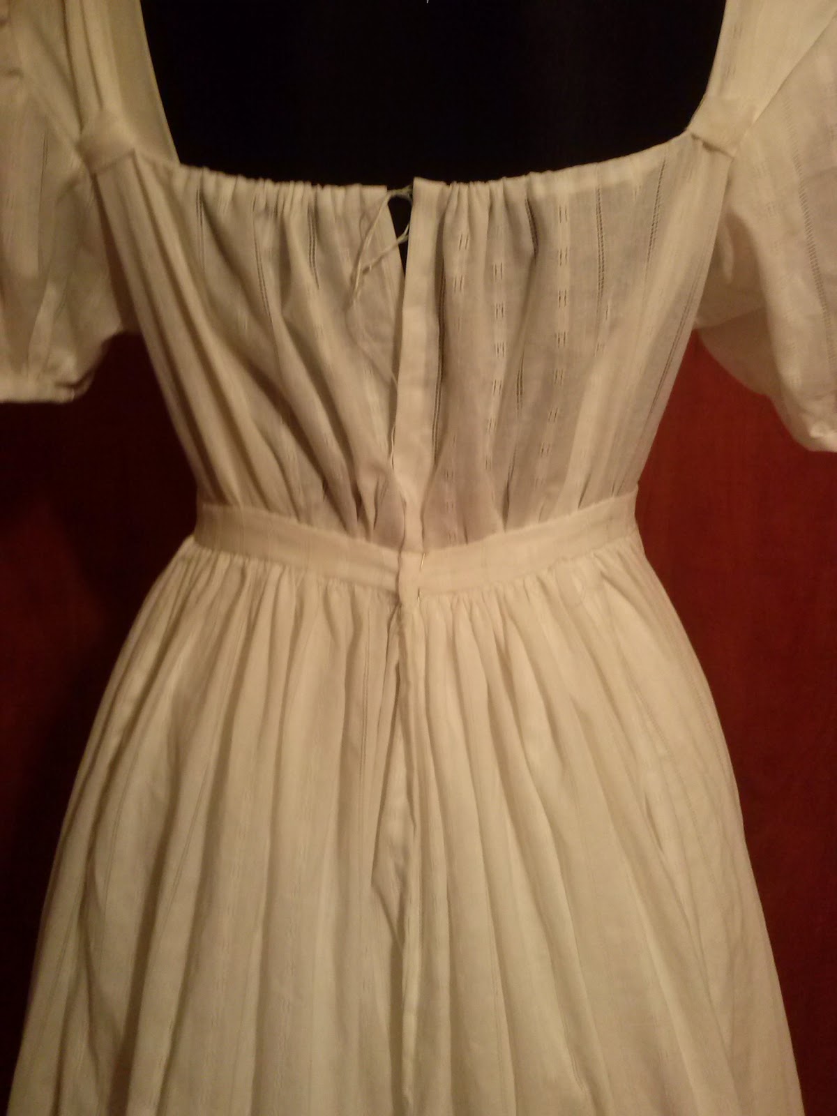 Uszyta z białego batystu w tłoczony, pasiasty wzorek, bez podszewki (trzymam się kurczowo nadziei, że 1.06 będzie ciepło). Uszyta w 90% ręcznie - po podłożeniu ok. 20m falban przeprosiłam się z maszyną do szycia i zmarszczyłam je maszynowo :)