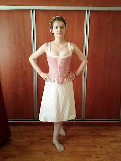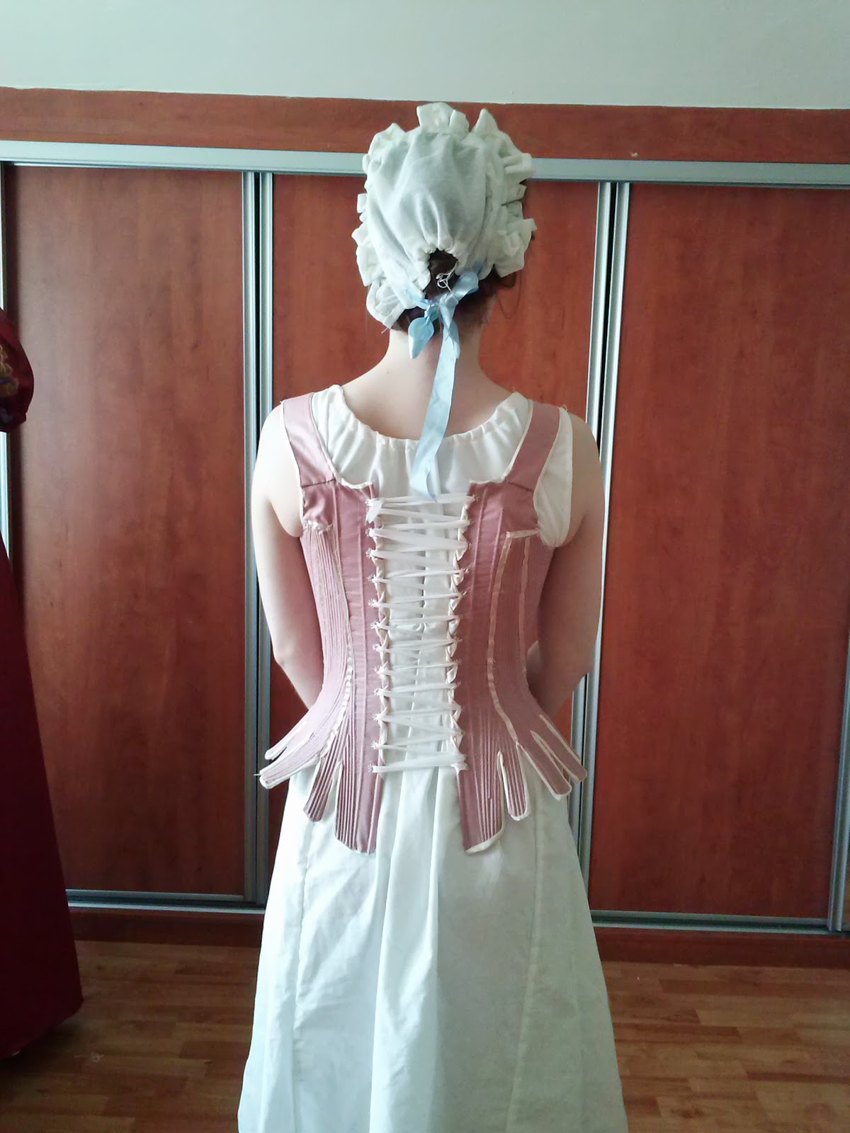 Back to the stays, they are made from 4 layers of cotton, boned with reed, hand stitched. As you may notice, the bonning pattern is very similiar to the stays from V&A Museum